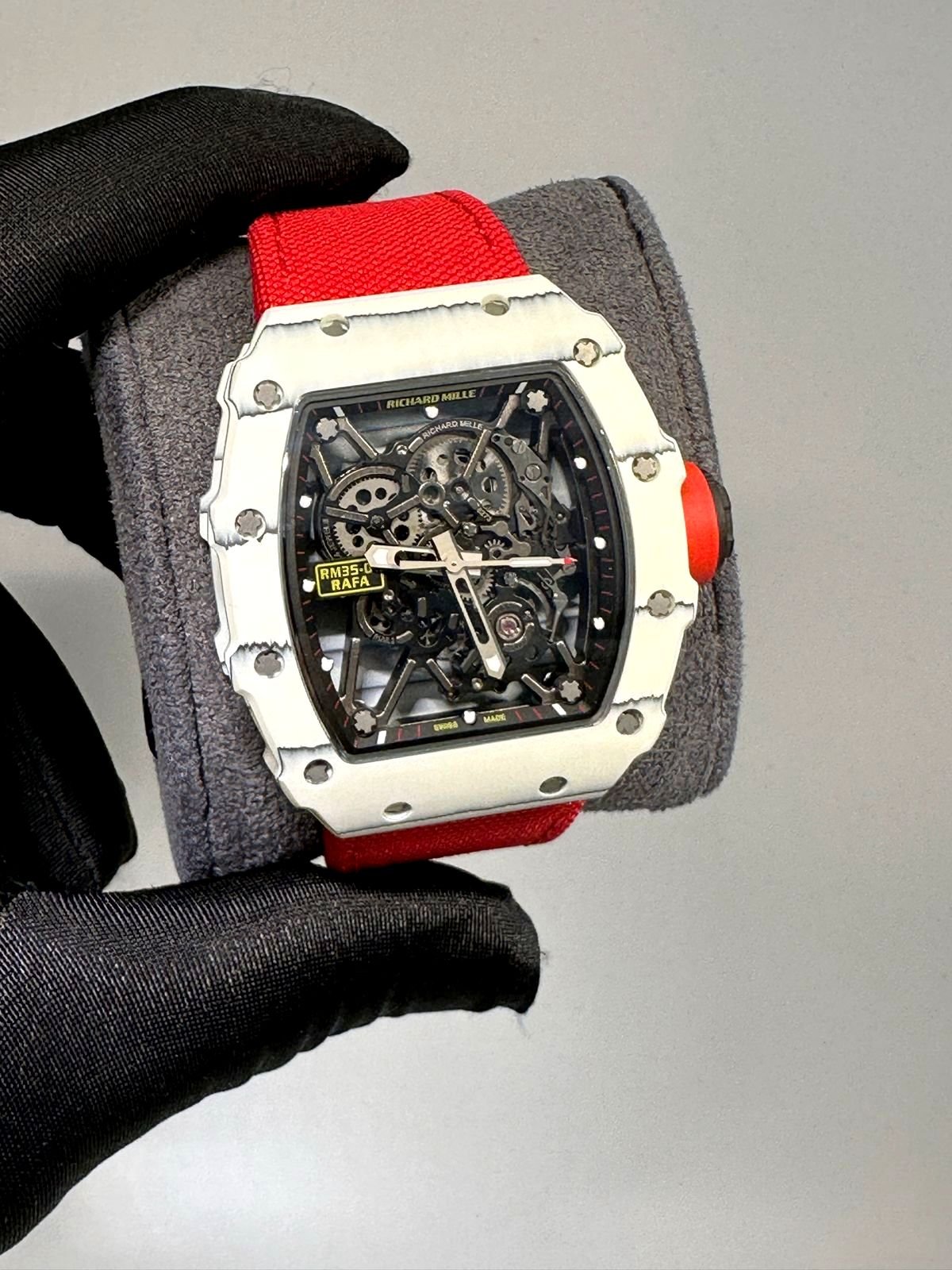 Richard Mille RM 35-01 rafa white bazel with red velcro strap super clone replica watches in dubai at watchesindubai.com