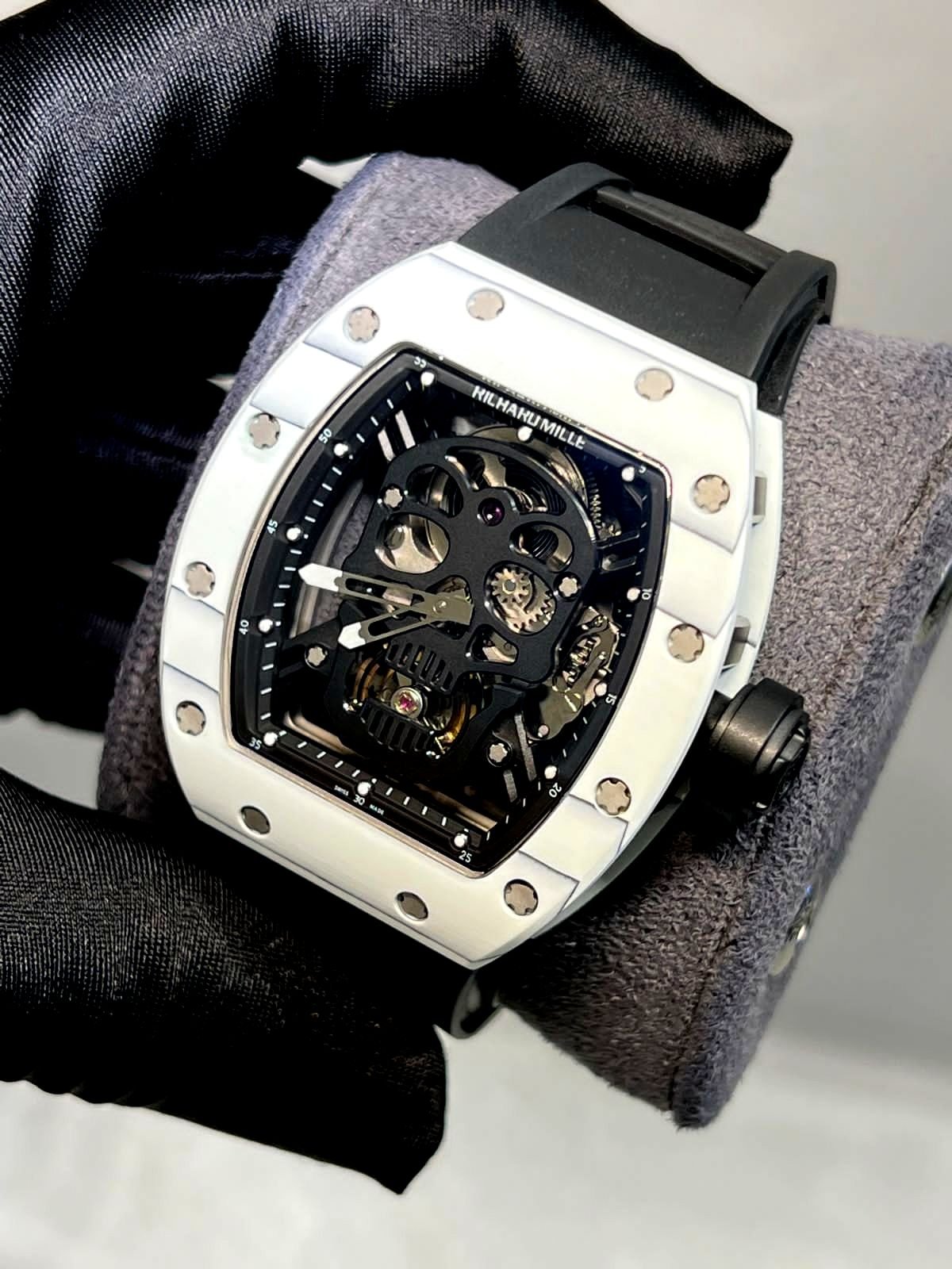 Richard Mille white watch with black skeleton with black rubber strap super clone watches in Dubai at watchesindubai.com