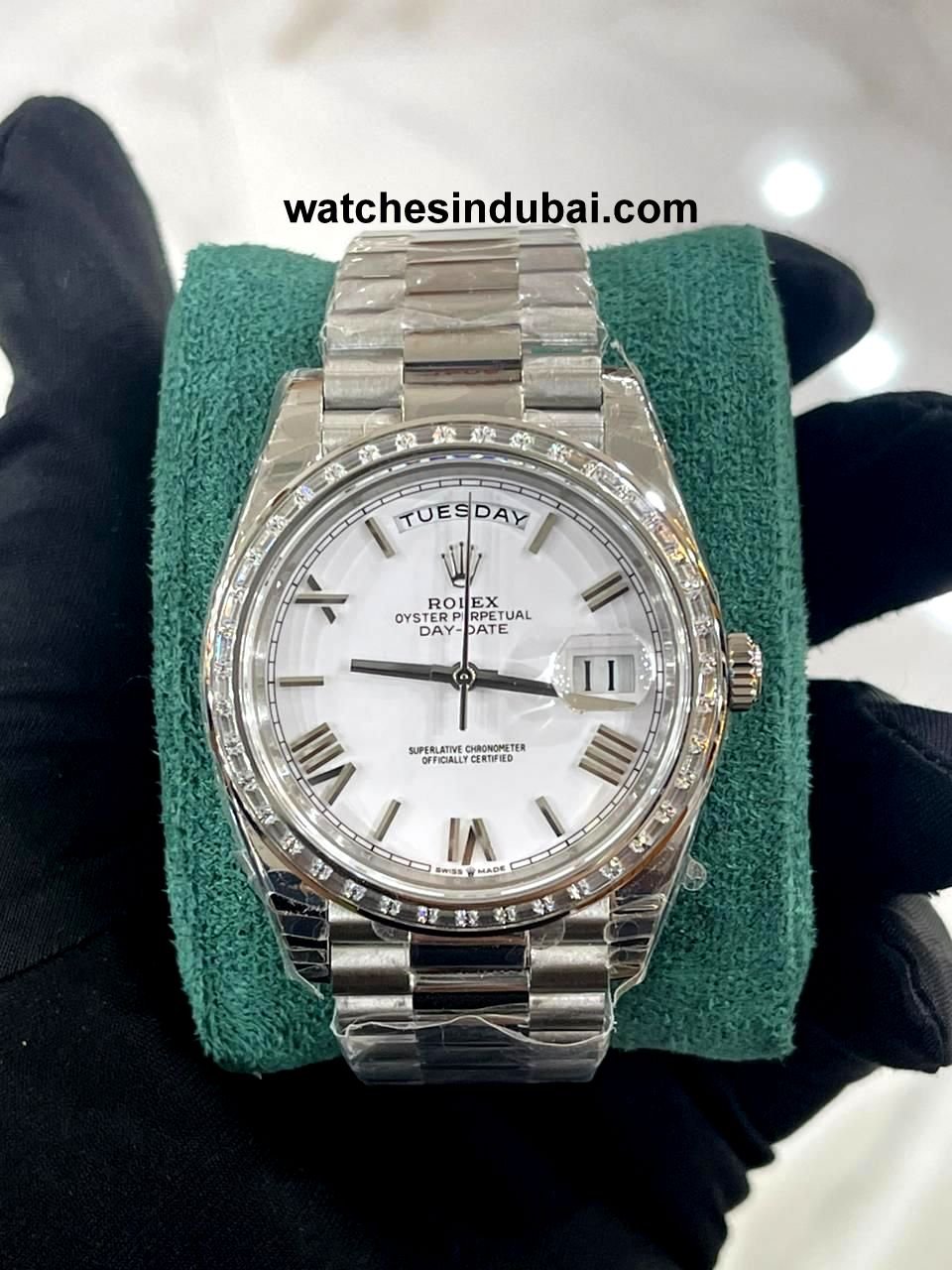 Rolex 40 mm Day date , White Dial with diamond super clone replica watches in dubai