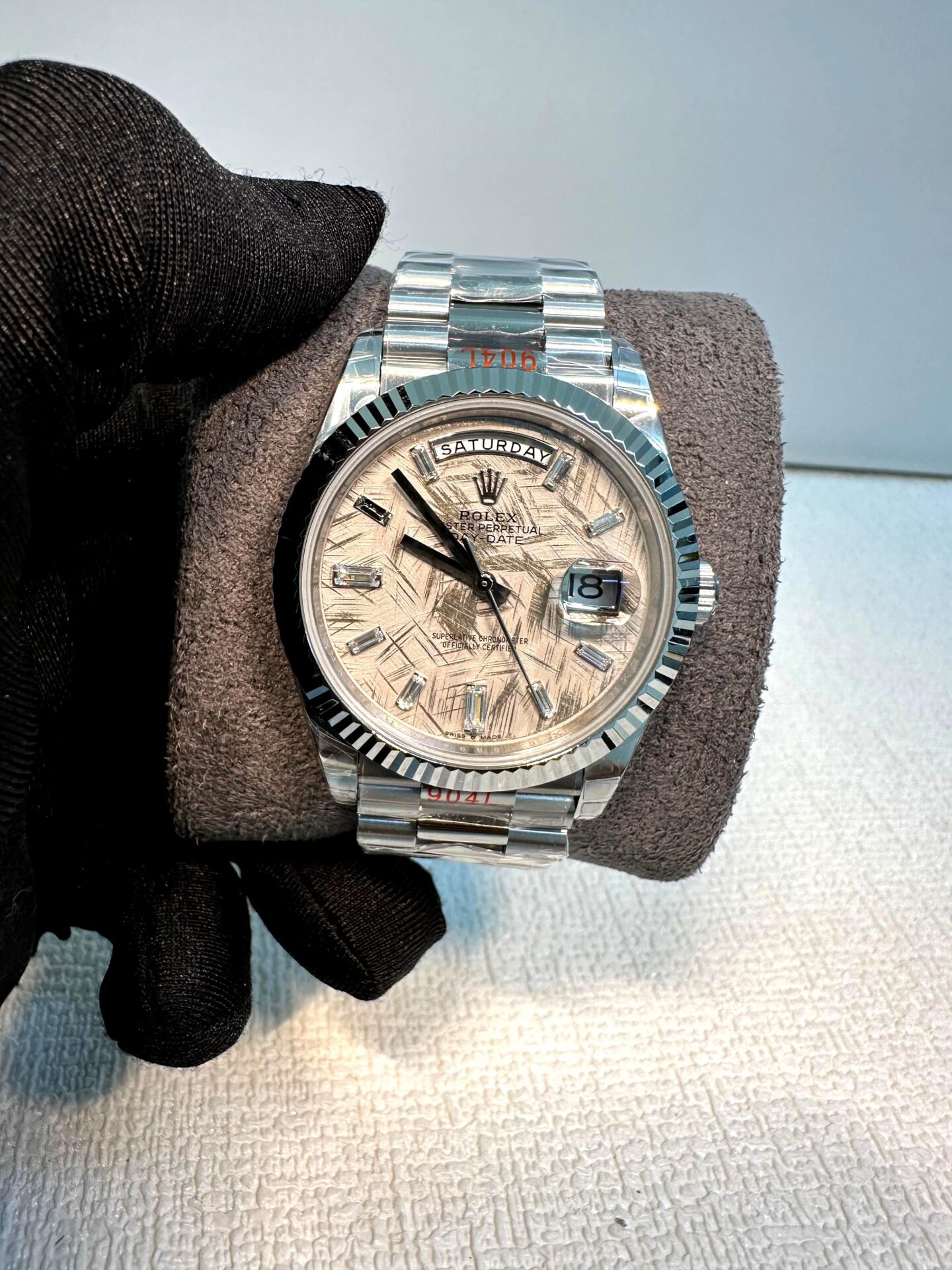 Protected by a scratch-resistant sapphire crystal and water-resistant to 100 meters, this watch is built to withstand the rigors of everyday life. The fluted bezel, a signature Rolex design element, adds a touch of classic elegance. The Rolex Day-Date 40 White Gold Meteorite Dial is more than just a watch; it is a statement of prestige and a testament to Rolex’s commitment to craftsmanship and innovation. It is a perfect addition to any luxury watch collection, offering a blend of timeless style and cutting-edge technology.